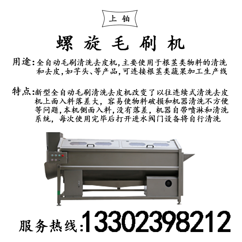 用途:全自动毛刷清洗去皮机,主要使用于根茎类物料的清洗和去皮,如芋头、等产品,可连接根茎类蔬果加工生产线。