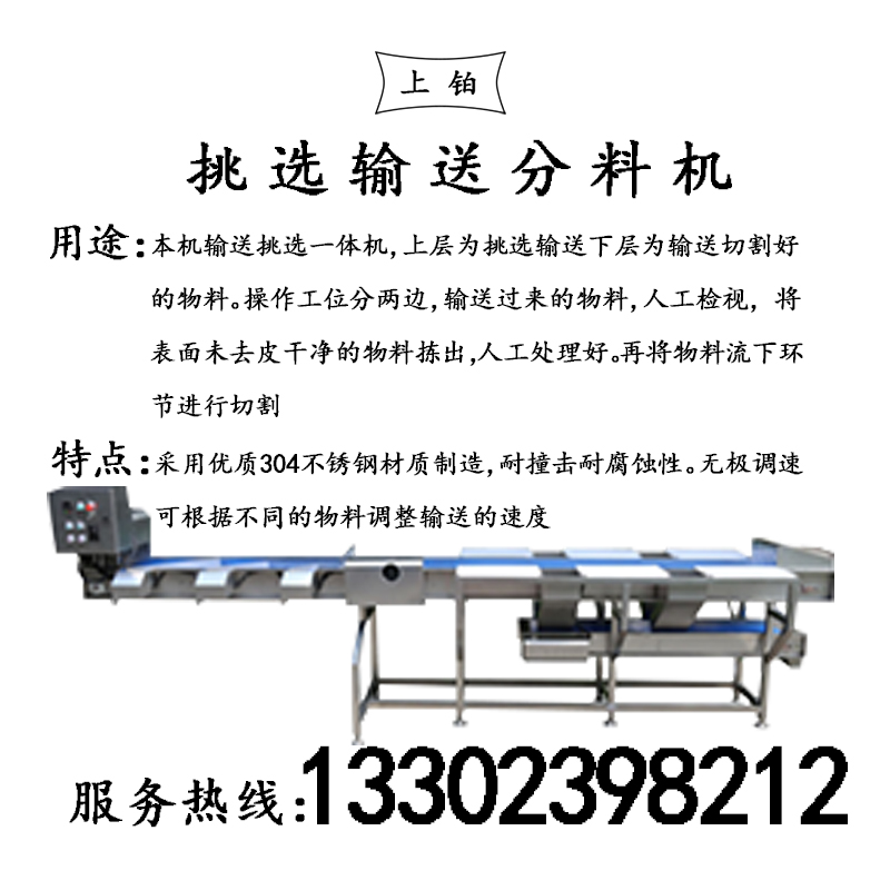 用途:本机输送挑选一体机,上层为挑选输送,下层为输送切割好的物料。操作工位分两边,输送过来的物料,人工检视,将表面未去皮干净的物料拣出,人工处理好。再将物料流下环节进行切割。