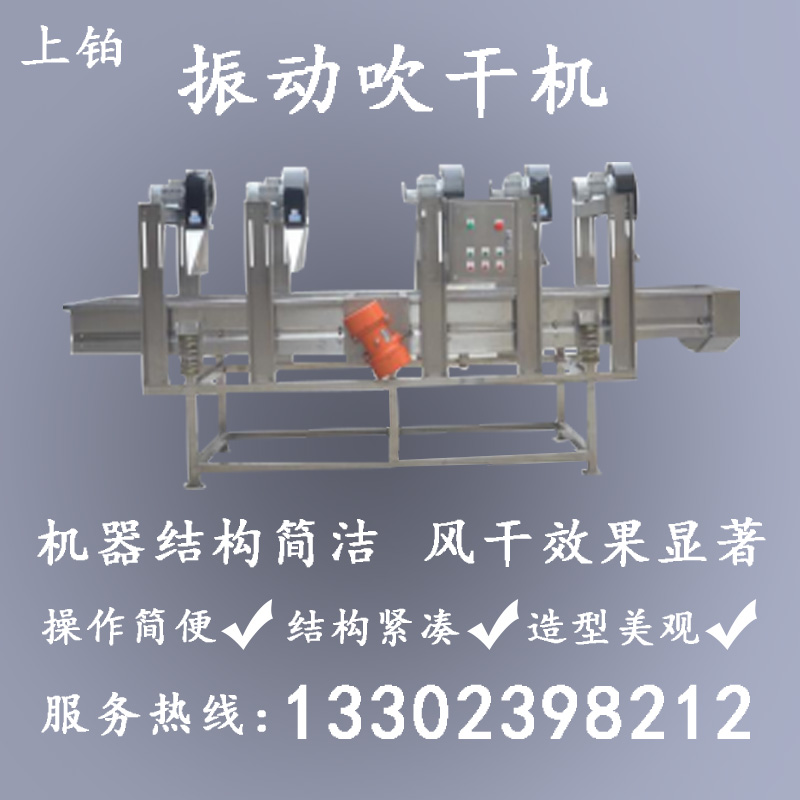 本机主要适用于蔬菜和食品加工企业使用,该设备有结构简洁、风干效果显著、不破坏蔬菜内部营养成分的特点。该设备利用震动电机震动来达到物料输送沥水并且上方有风机进行吹干,为了防止物料飞溅,上方装有网带。在净菜生产线中是不可或缺的风干设备,满足生产的自动化的需要。该机具有操作简便、结构紧凑、造型美观、维修方便等优点。