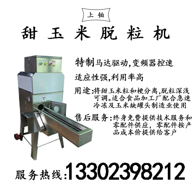 2.适合各种鲜、甜、糯玉米、冻玉米解冻后脱粒由特制马达驱动,更耐冲击,变频器控速。